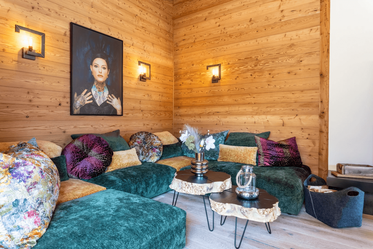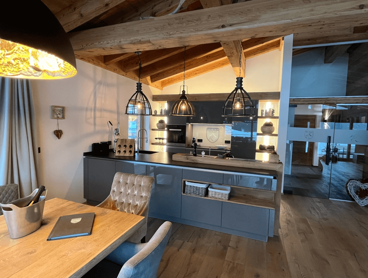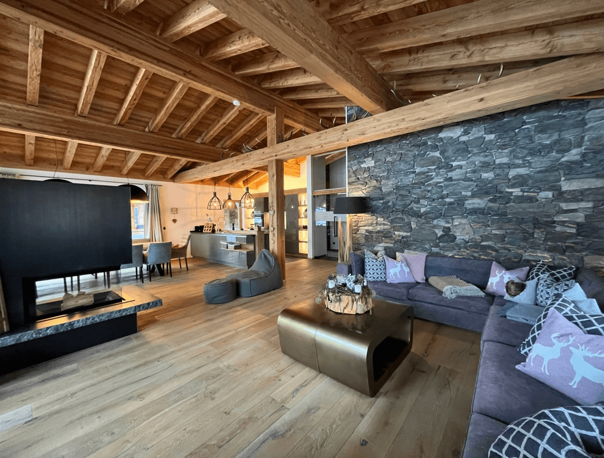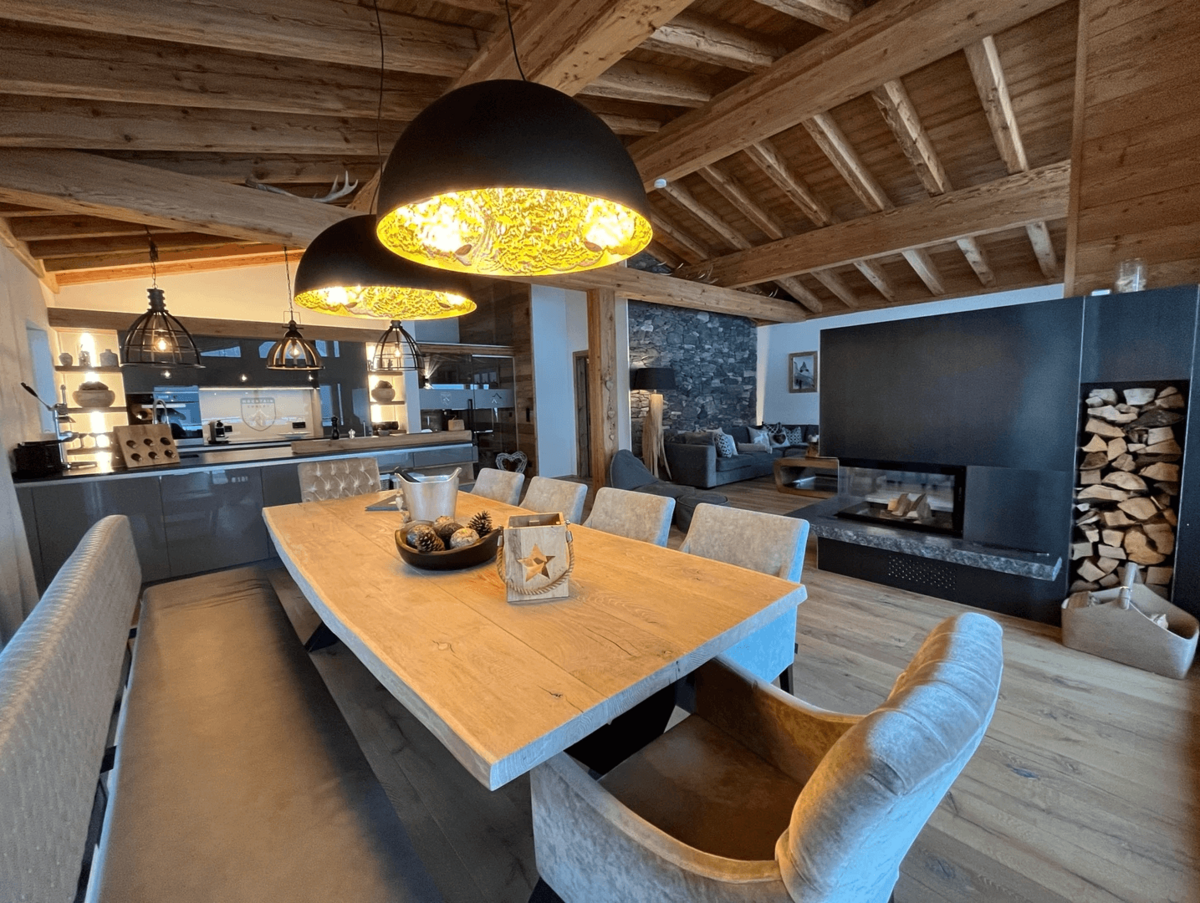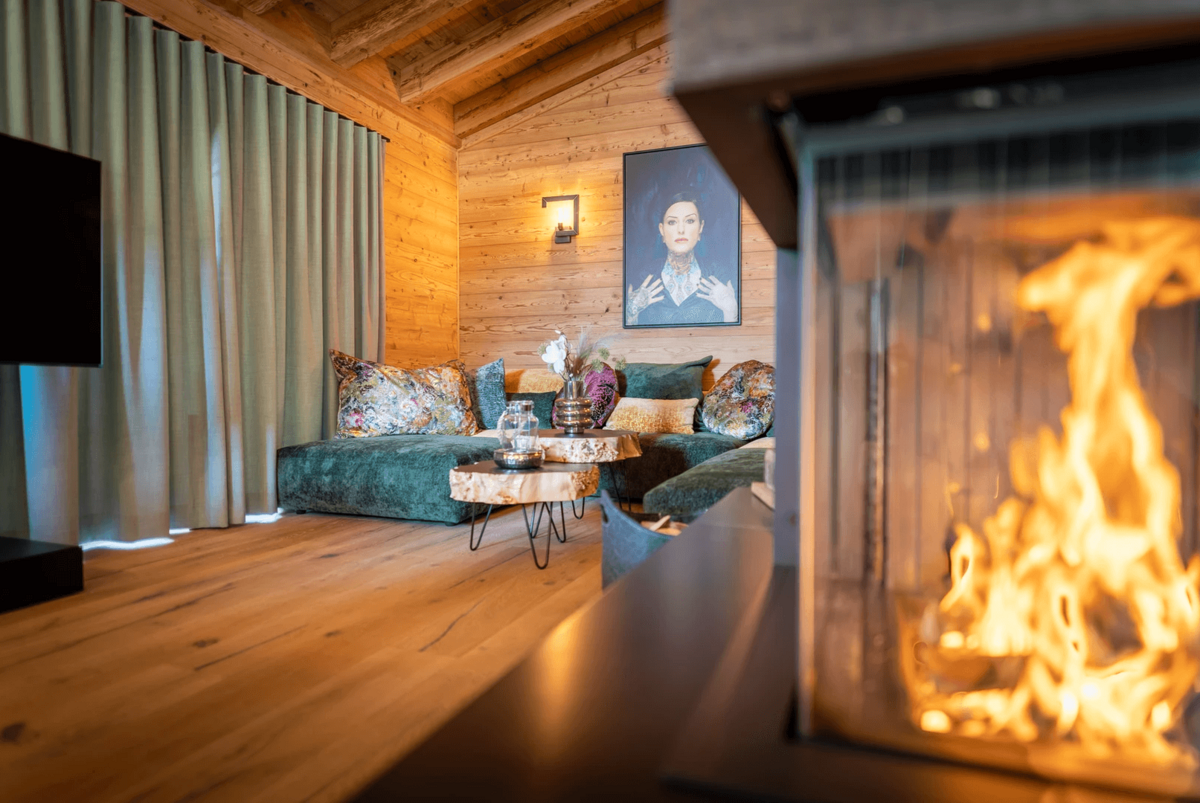 Die Chalets selbst beeindrucken durch ihre stilvolle Einrichtung und hochwertige Ausstattung. Natürliche Materialien wie Altholz und Naturstein schaffen eine gemütliche Atmosphäre, die durch moderne Designelemente ergänzt wird. Der offene Wohn-, Ess- und Kochbereich bietet einen atemberaubenden Blick auf die umliegende Bergwelt und lädt zu gemütlichen Abenden am Kamin ein.