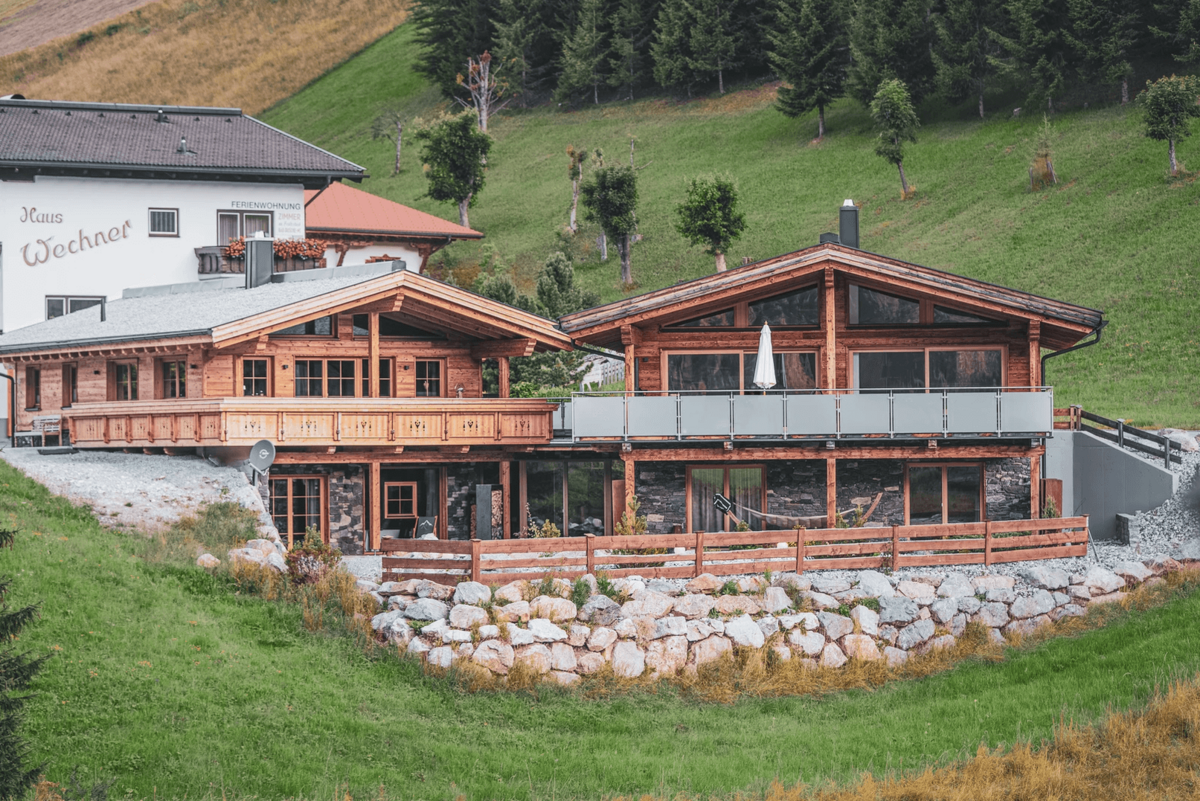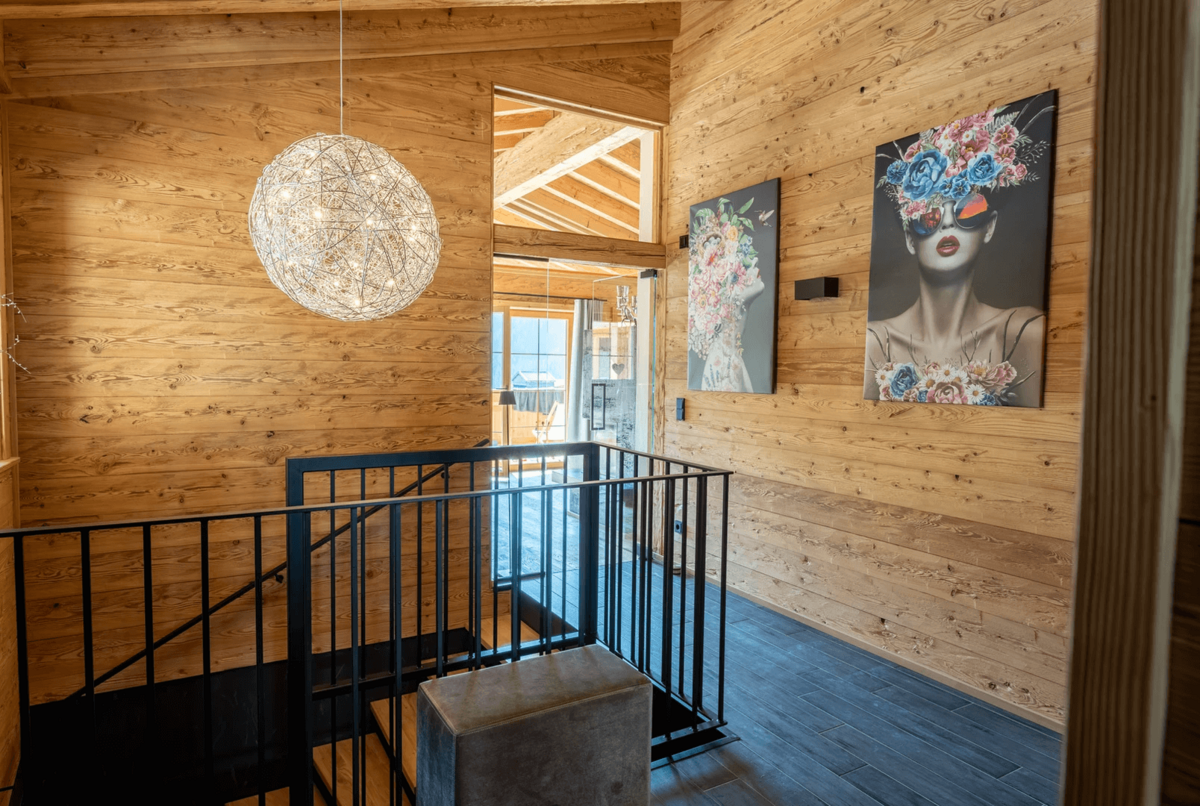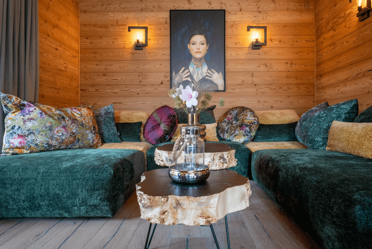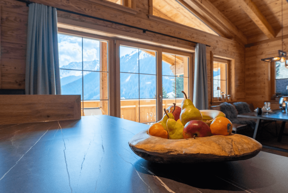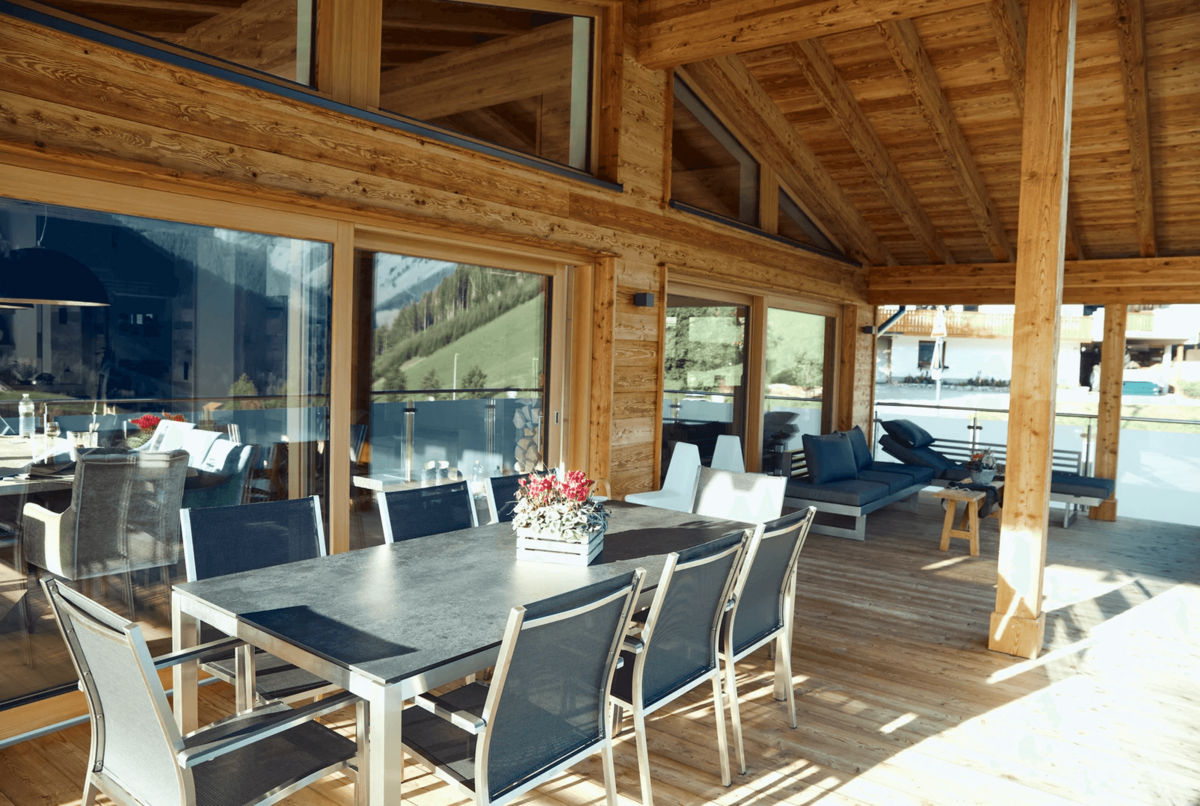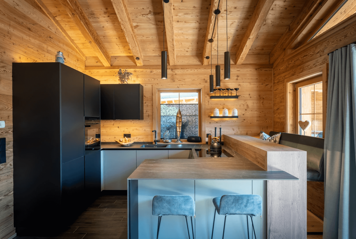 Die Chalets selbst beeindrucken durch ihre stilvolle Einrichtung und hochwertige Ausstattung. Natürliche Materialien wie Altholz und Naturstein schaffen eine gemütliche Atmosphäre, die durch moderne Designelemente ergänzt wird. Der offene Wohn-, Ess- und Kochbereich bietet einen atemberaubenden Blick auf die umliegende Bergwelt und lädt zu gemütlichen Abenden am Kamin ein.